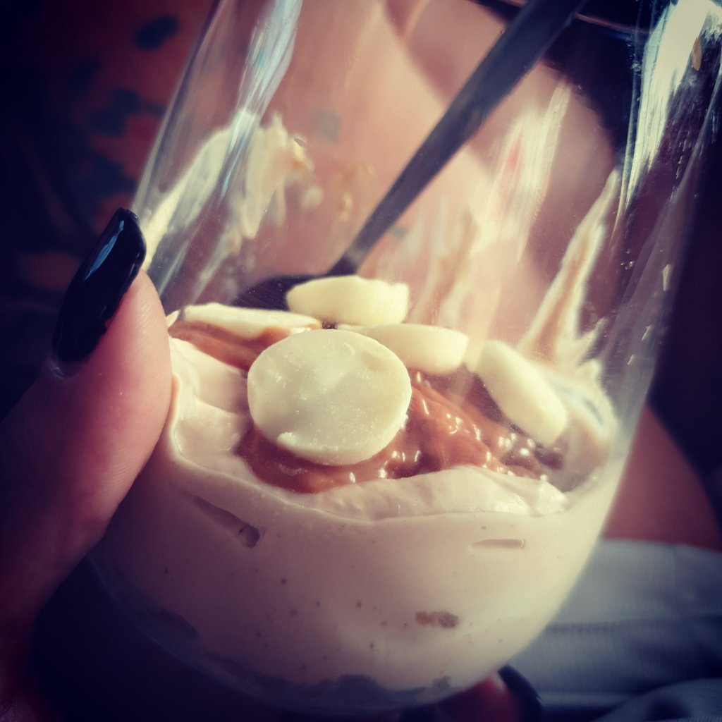 Mix a tub of Lindahls Kvarg, I love the white chocolate flavour, with a Dairylea light cheese triangle till it’s smooth & layer on top of the Grapenuts & pop to chill in the fridge for a few hours.